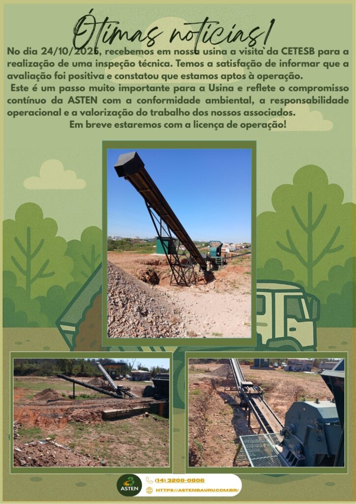 Inspeção técnica da CETESB, realizada em nossa usina no dia 24/10/2025, trouxe um resultado muito positivo. A avaliação confirmou que estamos aptos a operar de acordo com as exigências ambientais e destacou o cuidado da ASTEN em manter práticas responsáveis e sustentáveis.